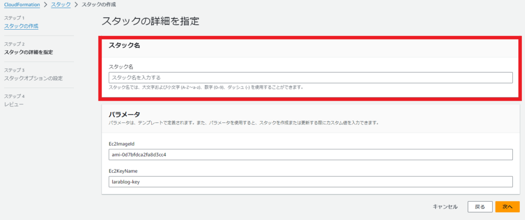 「larablog」とEc2ImageIdとEc2KeyNameのdefaultを変更してください。