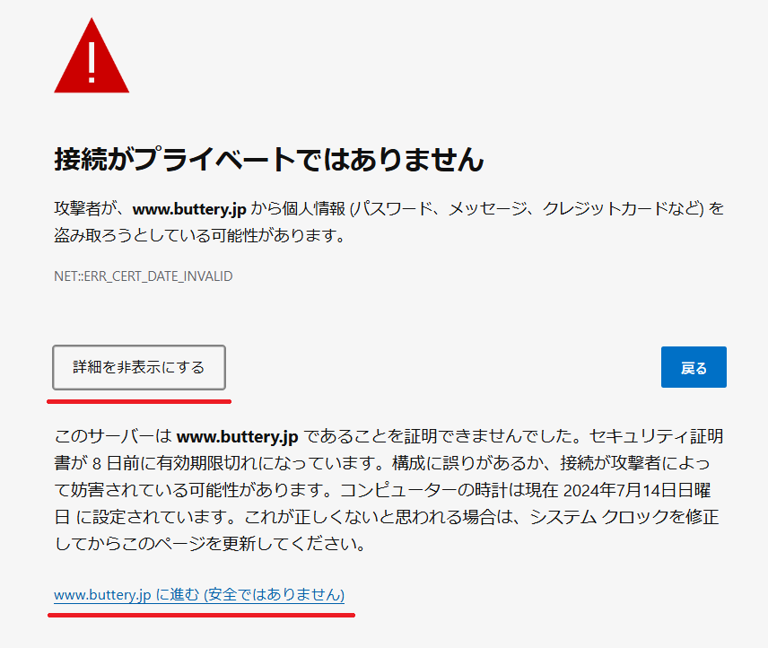 ブラウザでアクセスすると、上記のような画面が閲覧できるので、「詳細を表示」をクリックて、ドメインに進むをクリックすると、閲覧することができます。