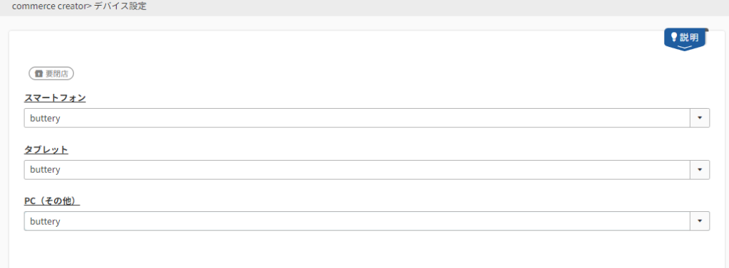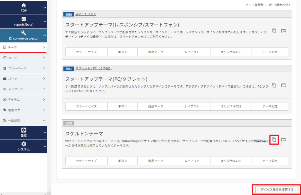 管理画面の「commerce creator→テーマ一覧」で現在使用しているテーマとインストールしているテーマを見ることができます。