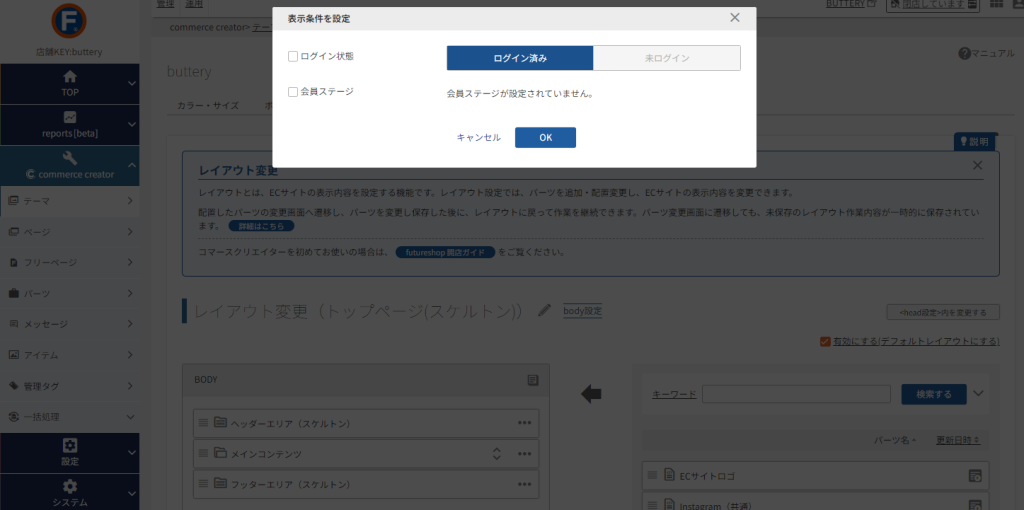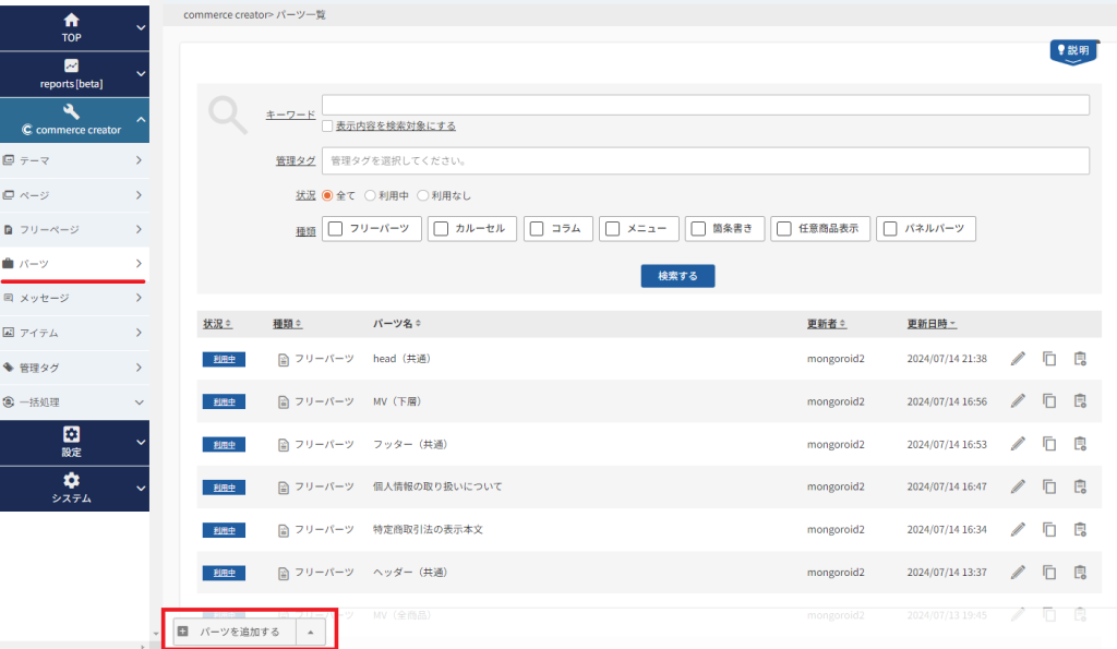「commerce creator→パーツ一覧」を見てます。