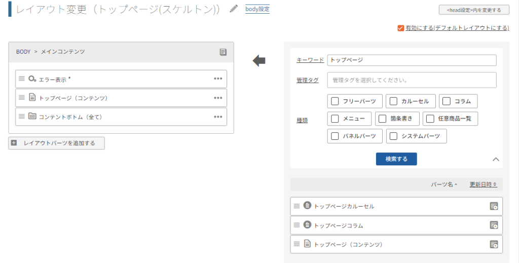 先ほどのレイアウトに戻ると、「トップページ(コンテント)」がありますので、反映します。