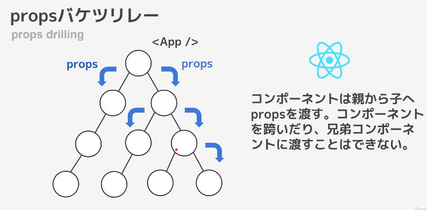 export default GrandChild;propsで親から子、子から孫へ値を渡すこともできるが、毎回propsを定義するの手間である。