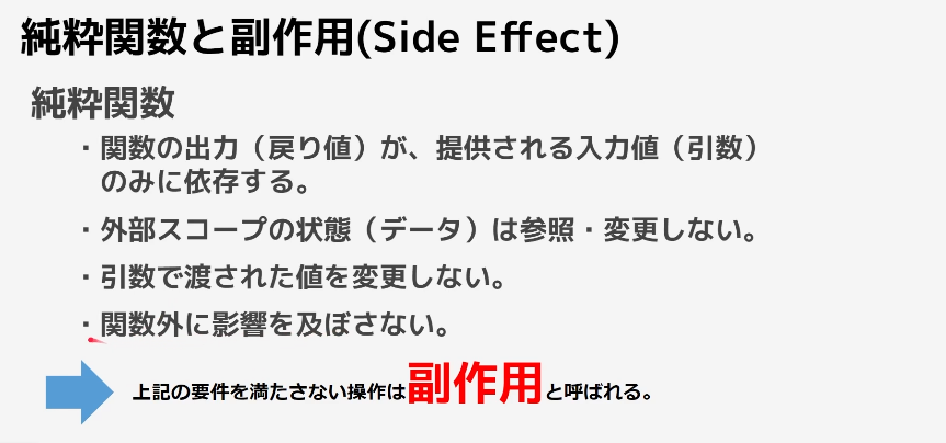純粋関数とは、画像の4つの項目を満たしている関数のことを指す
