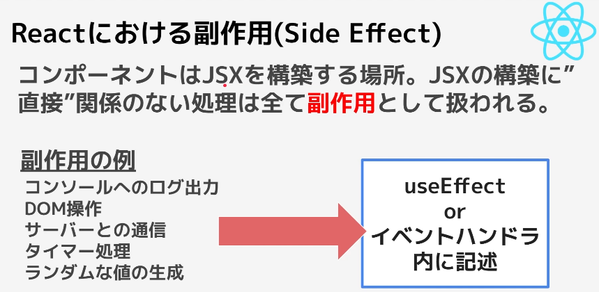 }, [time])なので、上記の様なコードの時には、useEffectが必要になる。