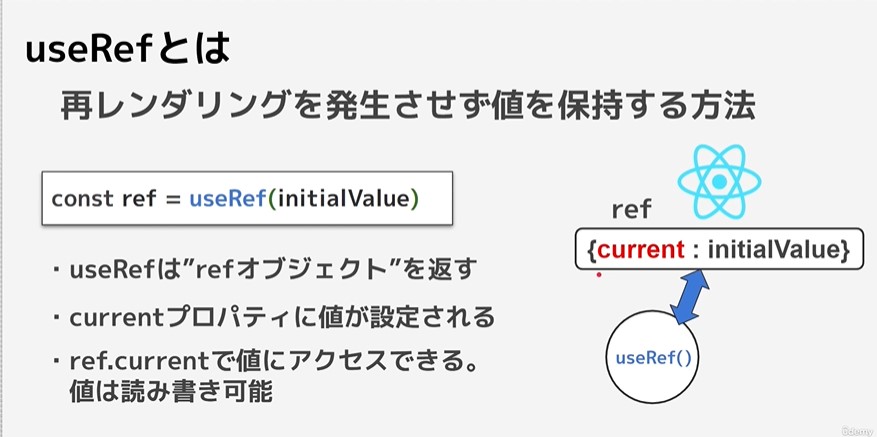 state は更新されるごとに再レンダーされますが、refオブジェクトの中身が変わっても再レンダーが走ることはありません。