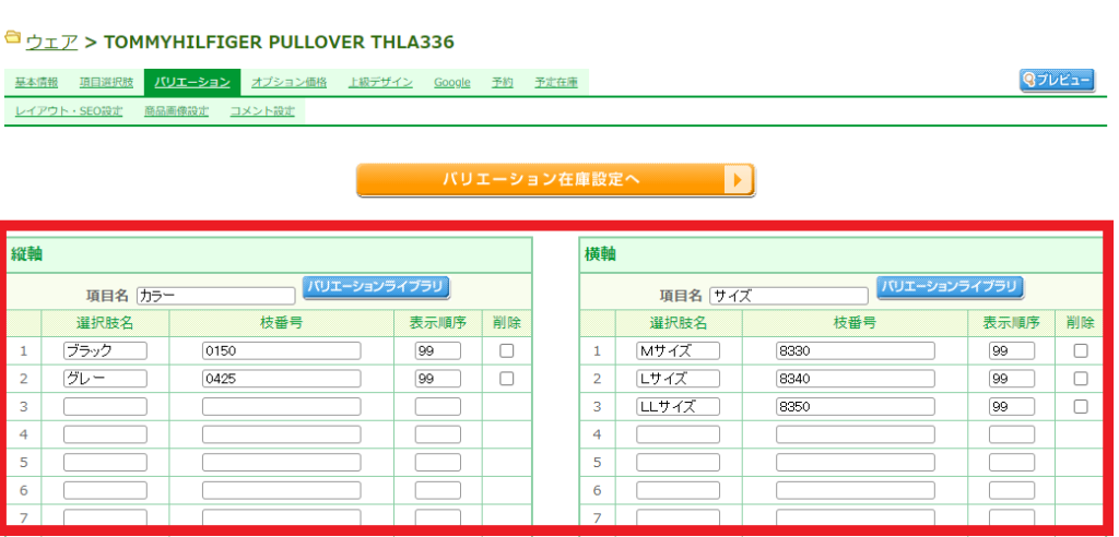 </div>futureshopには商品登録の際にサイズやカラーなどのバリエーションを設定することができます。