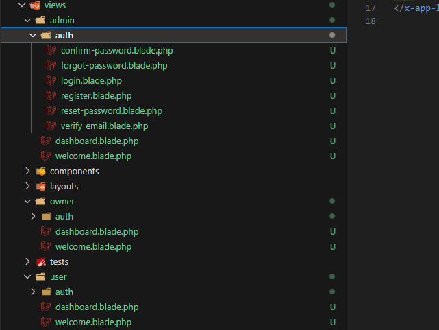 「resources/views/layouts/navigation.blade.php」ファイルがヘルパ関数(Laravel独自の関数)がユーザー用に設定されているため、複製して下記3つのファイルを作成する